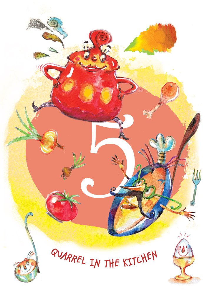Pot and Pan are cousins but they keep arguing who’s more important in kitchen than the other.