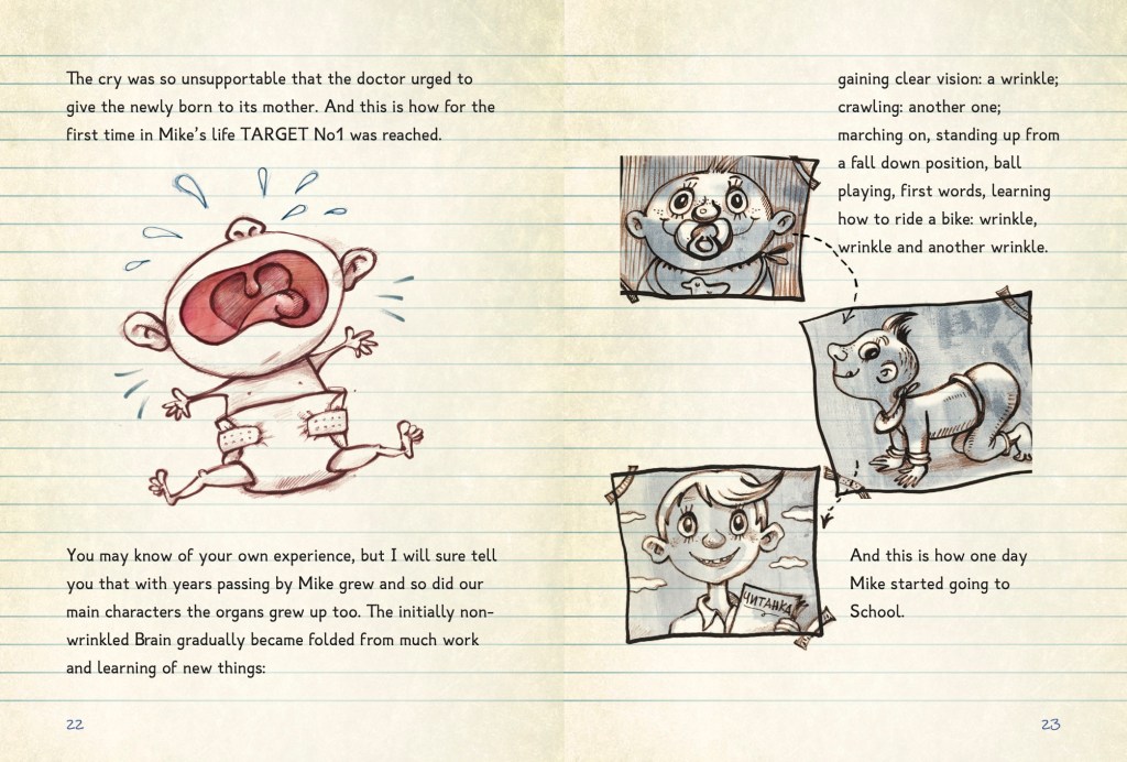 Of course it all starts when the baby is ready to be born, still in the mother womb. The brain gathers the organs to present them to each other and to explain them who’s the boss. Most of the body systems are described briefly. The brain explains them that they all have one goal: to cry loudly if the body needs food or care.