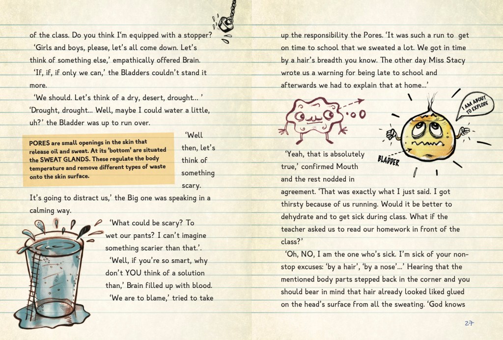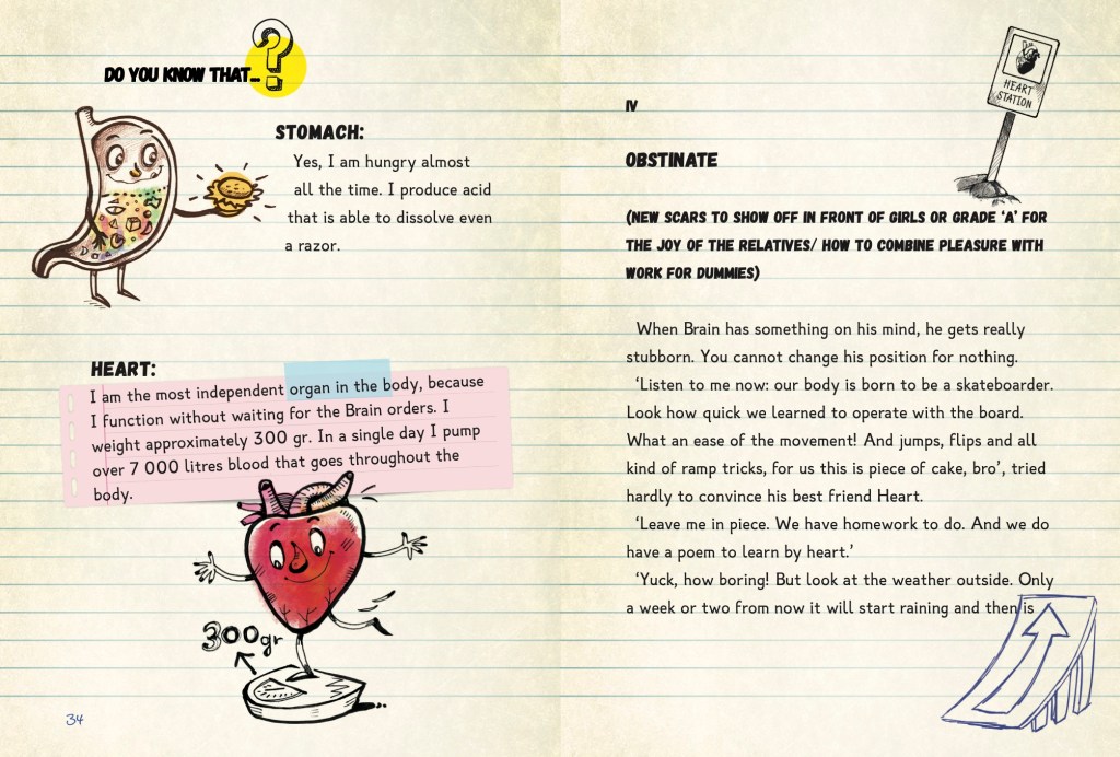 The book starts with a brief summary of how our body works, as to introduce the subject. We are inviting kids to take a ‘sightseeing’ journey into Michael’s body. They are warned about the existence of ‘scary’ words like: blood, liver, heart, etc. The tour starts through the MOUTH, where kids must beware of the 32 hammers (the TEETH) that fall down and smash with a power of 58 kg per square centimetre on their victims. Then kids should pass through the tunnel called THROAT where they will meet the two guards — Ping and Pong — the TONSILS. Then the cardio-vascular system is explained where the blood, or the sticky liquid is constantly being transferred thanks to ARTERIES, VEINS and CAPILLARIES. The importance of the HEART and its functions is briefly explained. Then the BRAIN is described as a huge computer connected to millions of other computers, each one of which is responsible for different things as our thoughts, feelings, memories, sensors, etc. through the power of its wires (the NEURONS).