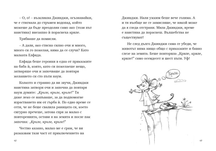 The main character of this juvenile novel is called Ginger Rosmarine Longtail, or Jinji (Gingi, Gingy, Jingi) in short. She is a tiny mouse, known for being afraid of everything (especially scary noises). She lives in the mouse hole with her big mice family consisting of her mother, grannie and grandpa and many brothers and sisters. Her best friend is a platypus, called Roundy (he’s clumsy and shy, a little oversized), who is also a Kings’ official. They all live on a planet where humans and animals live together and speak same language.